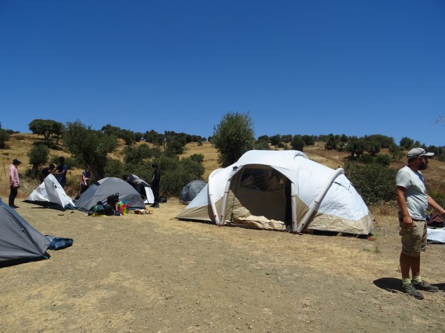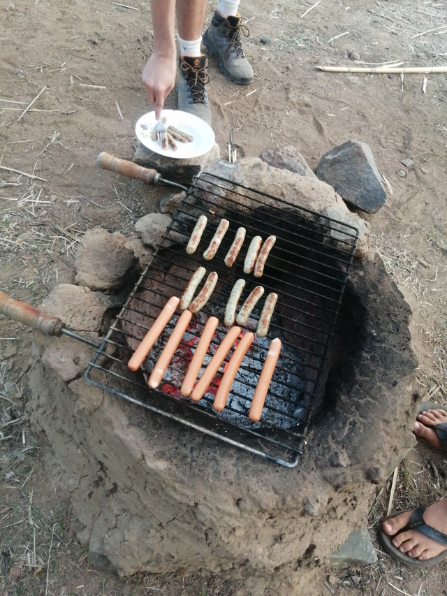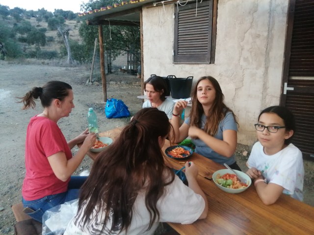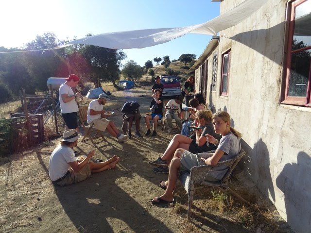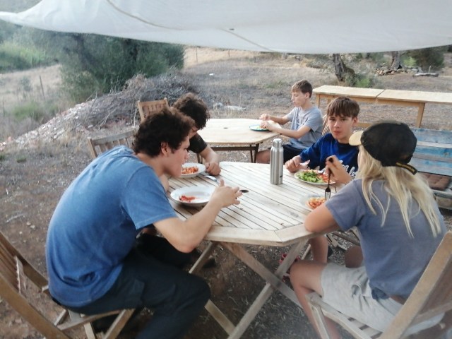 There is a covered teaching area that also serves as a common area for breaks, as well as an outdoor kitchen where meals are prepared and food is served.