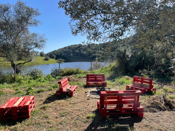 There is a covered teaching area that also serves as a common area for breaks, as well as an outdoor kitchen where meals are prepared and food is served.